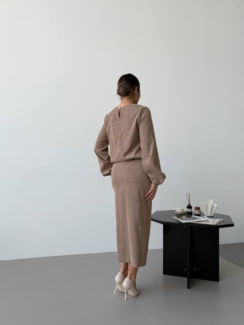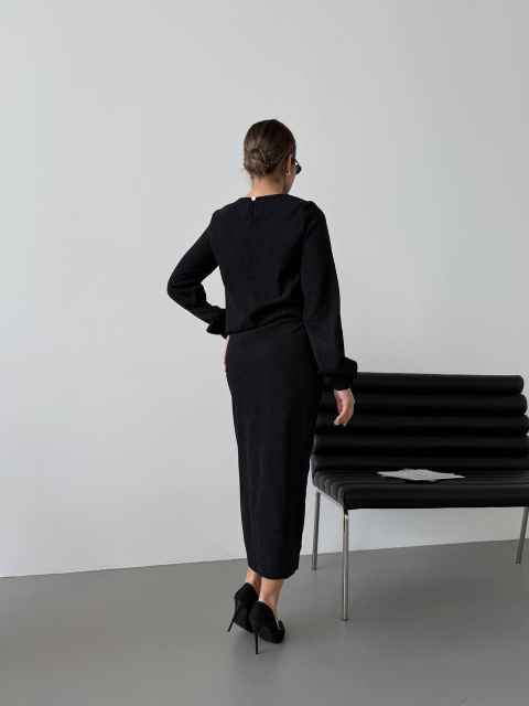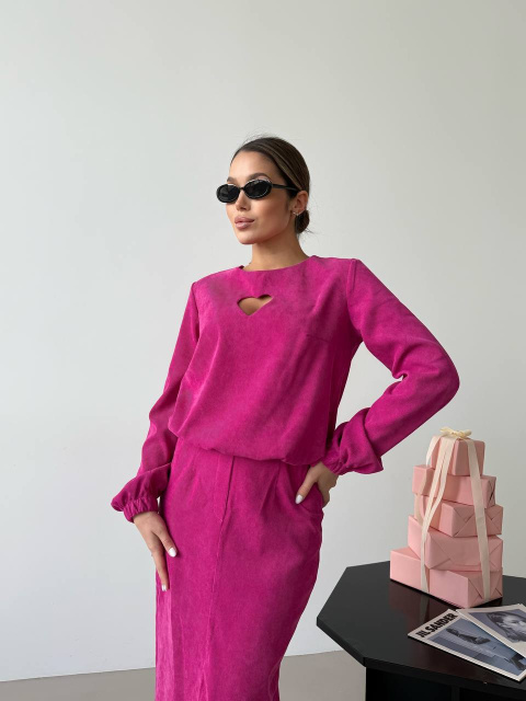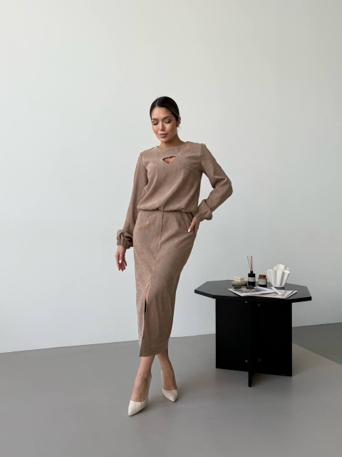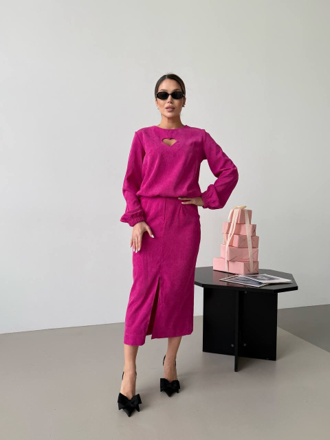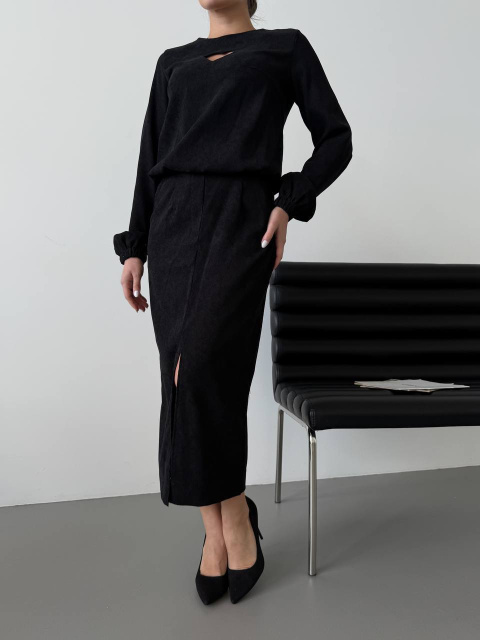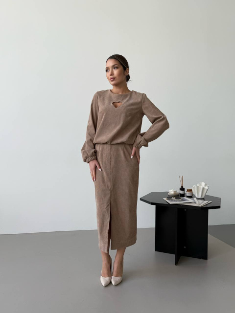 Стильный вельветовый костюм – идеальный выбор для элегантного образа! Комплект состоит из блузы с оригинальным вырезом и миди-юбки с разрезом, который добавляет утонченности. Мягкая, приятная к телу ткань обеспечивает комфорт в течение дня. Идеально подходит для работы, встреч или особых событий. Заказывайте сейчас и создайте безупречный лук! Размеры: 42-44, 46-48, 50-52.