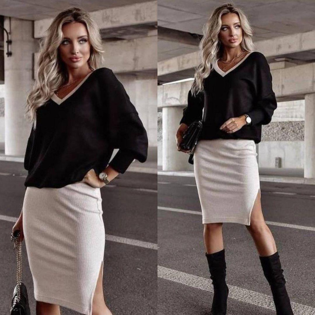 - низ - облегающая юбка миди с разрезом до середины бедра;