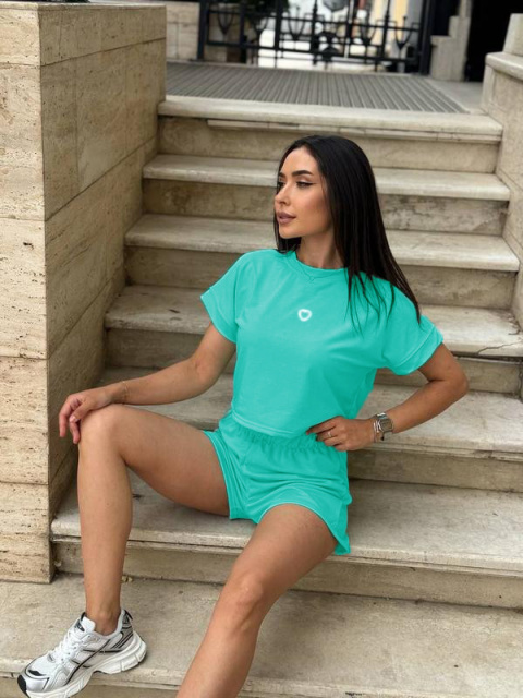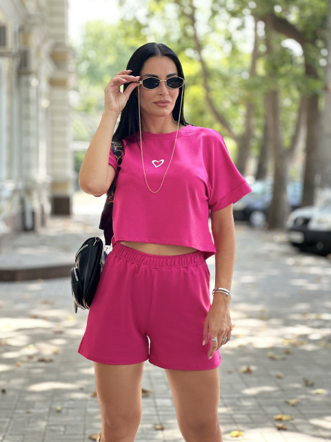Костюм состоит из укороченной футболки и коротких шорт. Шорты обладают высокой комфортной посадкой. Модель имеет широкий пояс на эластичной резинке, которая не впивается в кожу и не передавливает живот. Также с обеих сторон есть вместительные карманы. Футболка имеет неглубокий круглый вырез горловины. Спереди украшена минималистичным принтом в форме маленького сердечка.
