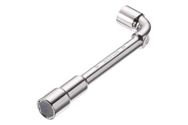Ключ торцевой с отверстием L-образной формы. Обе головки имеют одинаковый размер (длинный конец имеет 6 граней, а короткий 12). Размер ключа: 18 мм