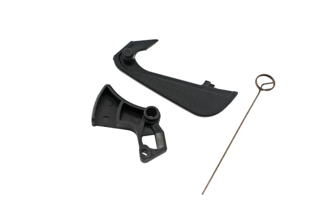 Курок газа устанавливается на бензопилу и выполняет функцию соединения и защиты. В комплект входит: курок газа; курок защиты; пружина.