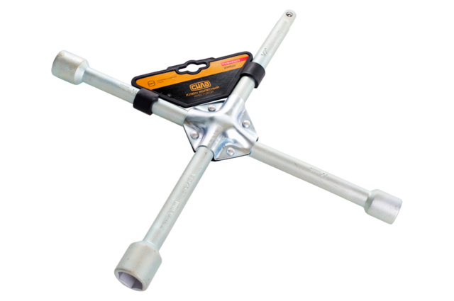 Баллонный крестовой ключ удобный универсальный ключ для монтажа автомобильных колес. Наличие клепаной пластины на крестовине обеспечивает дополнительную прочность и долговечность конструкции ключа. Размеры головок: 17, 19 и 22 мм. У одного основания имеется квадрат на 1/2" для закрепления в нем дополнительной головки любого размера с квадратом 1/2".